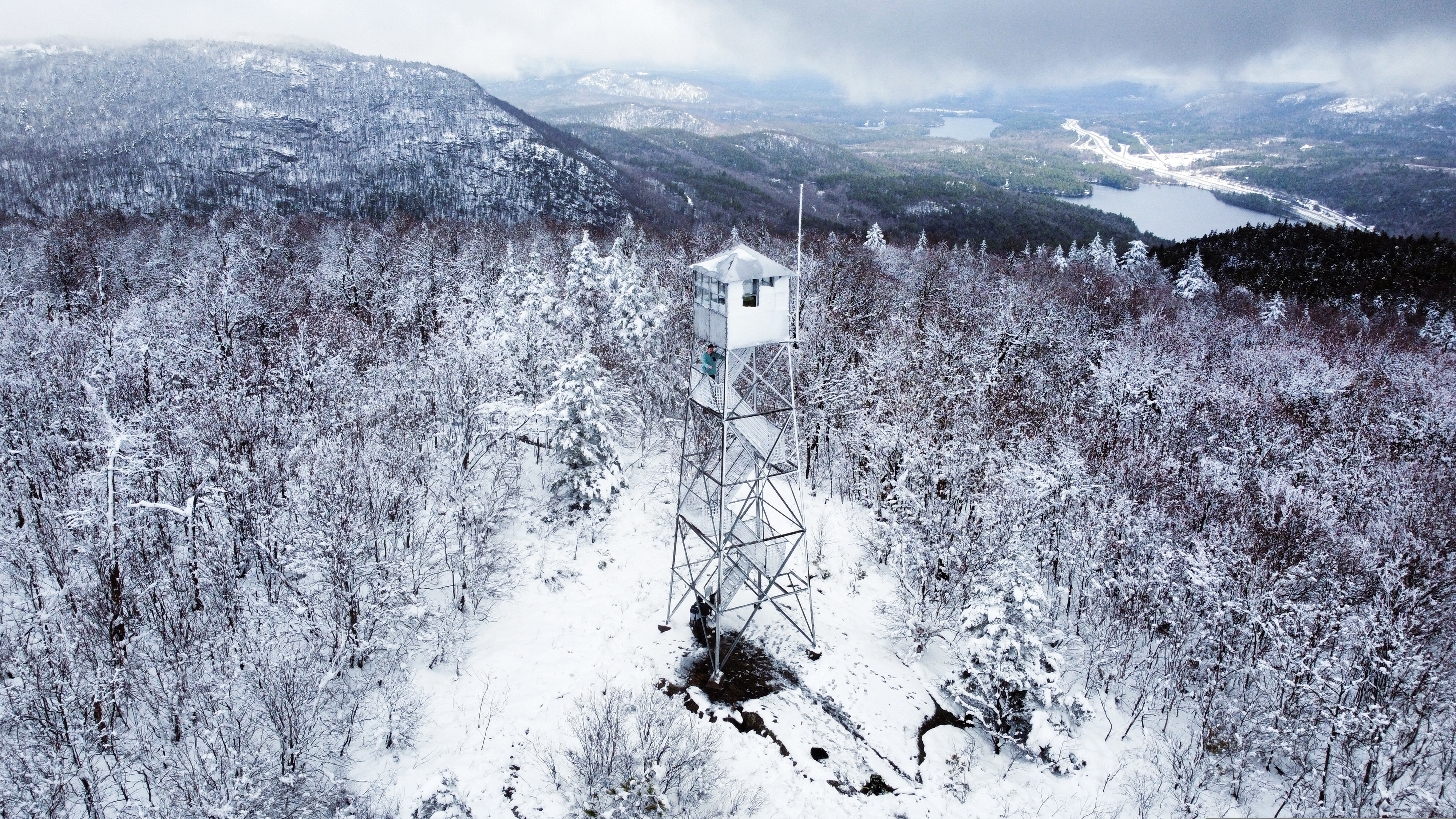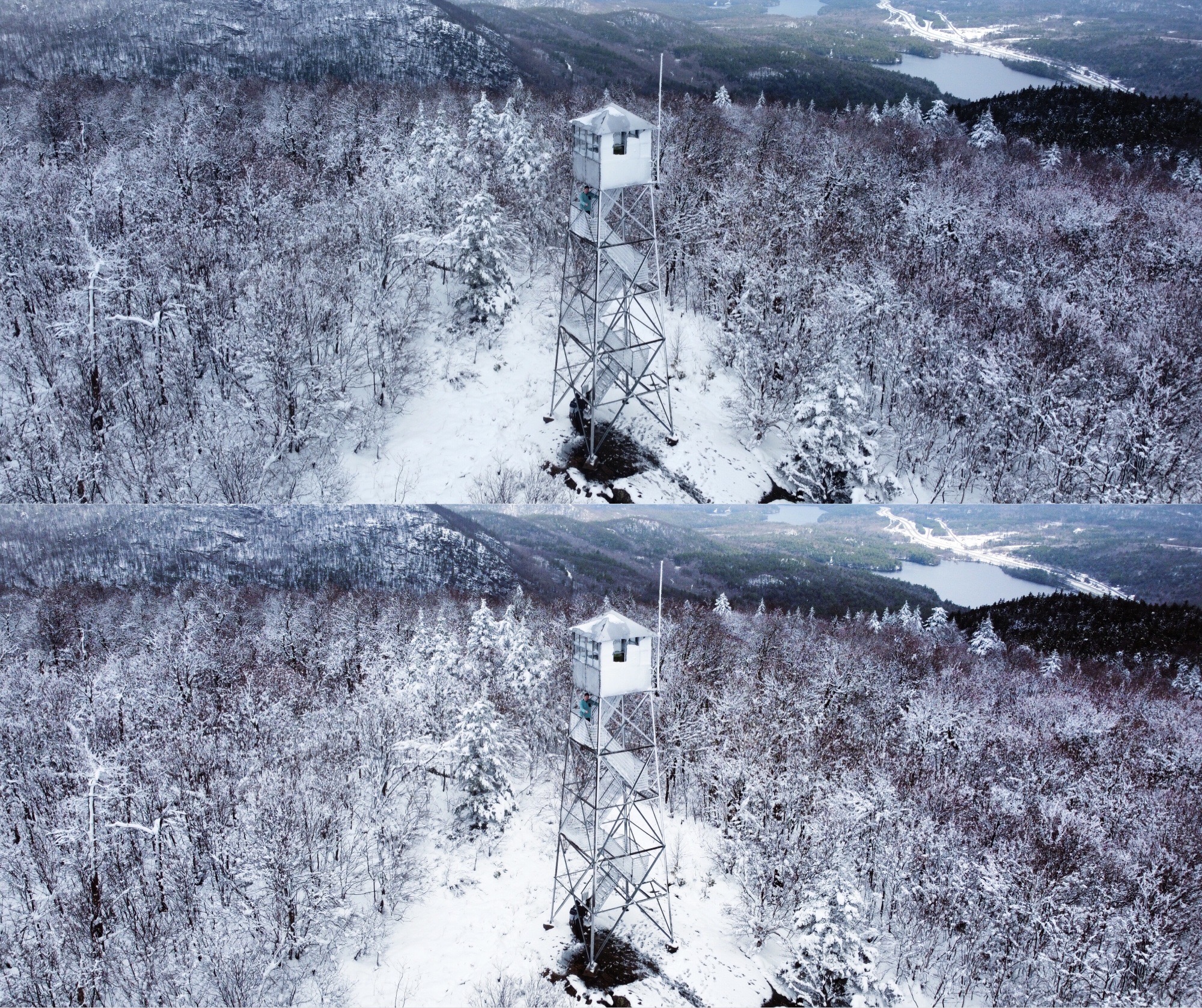Around forty five minutes before this photo, I took flight near a reflecting pond. There was a good amount of snow along the entire hike and its accumulation was quickly falling off of trees. I brought my drone to land near me and had to put my arms over it to stop snow from hitting it. A smaller piece made contact with it so it began to go up again and cut my fingers. There was a decent amount of blood on the arms of my drone and on other equipment too. This only occurred considering that a cut on a finger bleeds more than a cut on your arm, in most situations. When everything healed later that night, they looked like small scratches but I made sarcastic comments about how tough I am, as one should. Once we reached the summit, I couldn’t wait to take it back out. Shortly afterwards, I created one of my favorite aerials since owning this little helicopter.